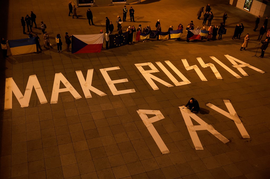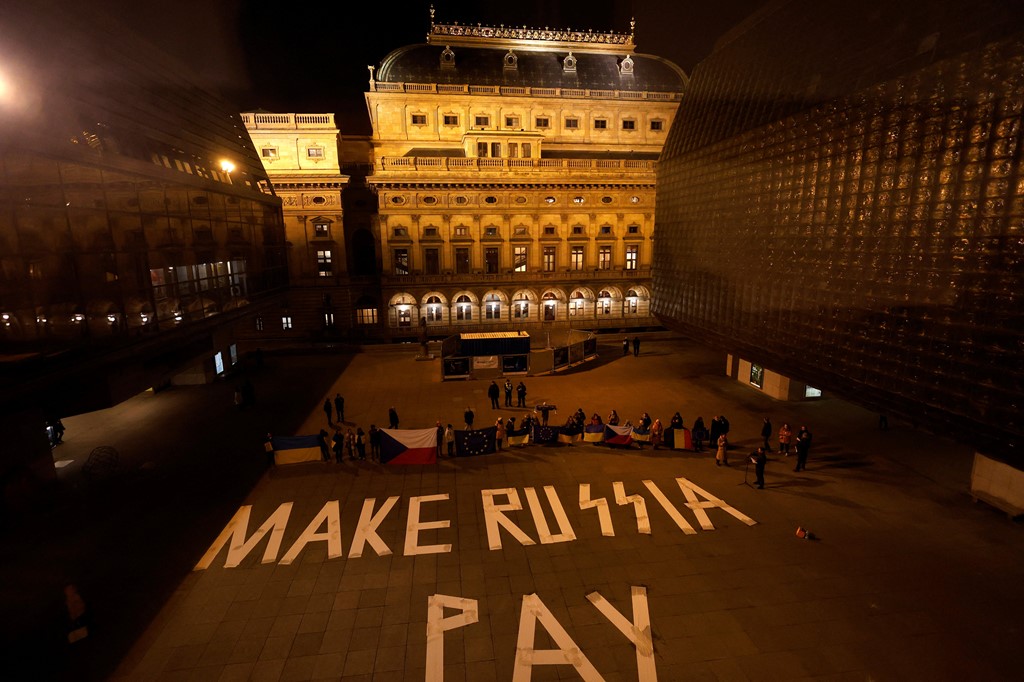 Біля Національного театру Праги помітили групу людей, які тримали прапори Європейського Союзу, Чехії та України. Вони стояли поруч із гігантським підлоговим стендом, на якому написано «Змусьте Росію платити». Про це повідомляє Sky News.